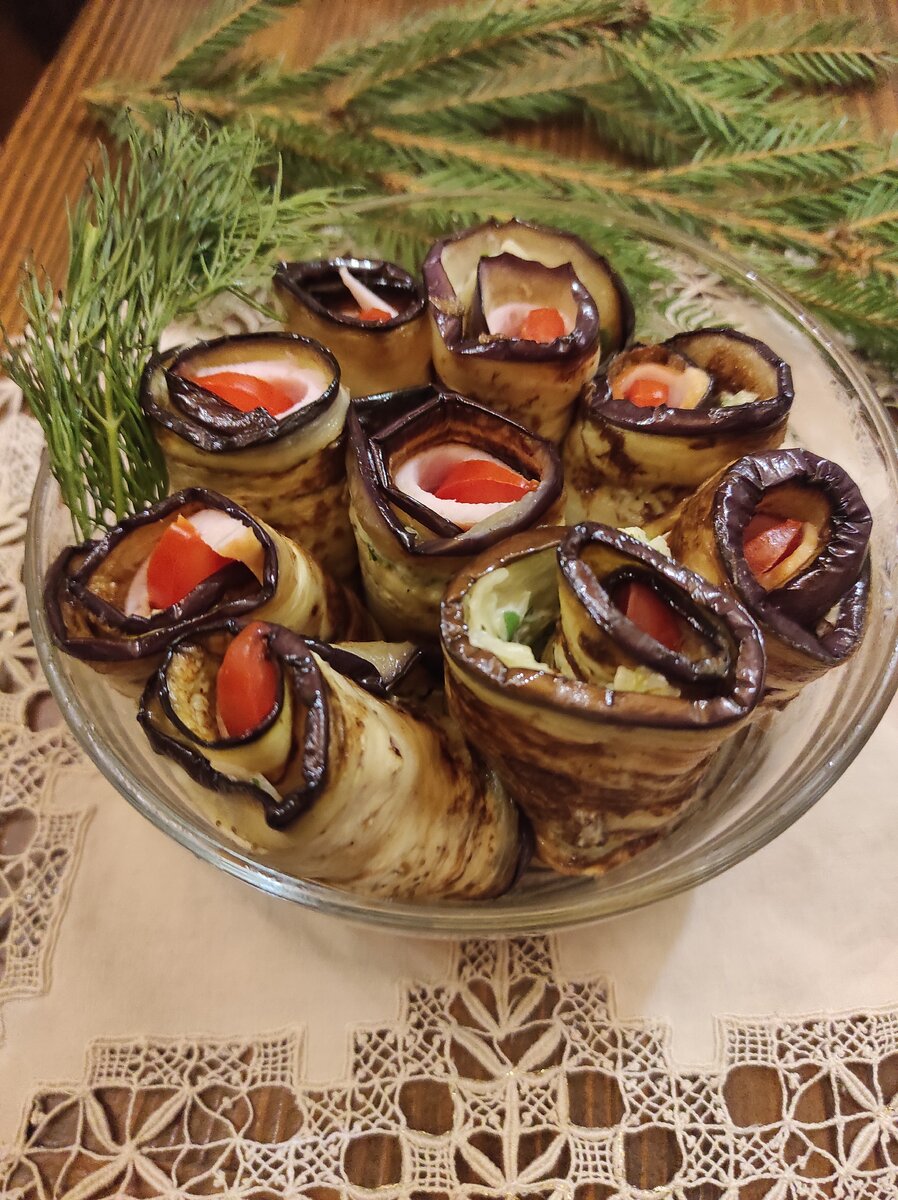 На каждый слайс баклажана выкладывают немного сырной смеси, добавляют ломтик карбонада и дольку помидора. Затем аккуратно заворачивают рулет от стороны с помидором к начинке, стараясь завернуть помидор внутрь. После этого рулетики помещаются в салатницу вертикально и могут подаваться как в тёплом, так и в холодном виде. Это блюдо станет отличным вариантом закуски как для обычного ужина, так и для торжественных мероприятий.