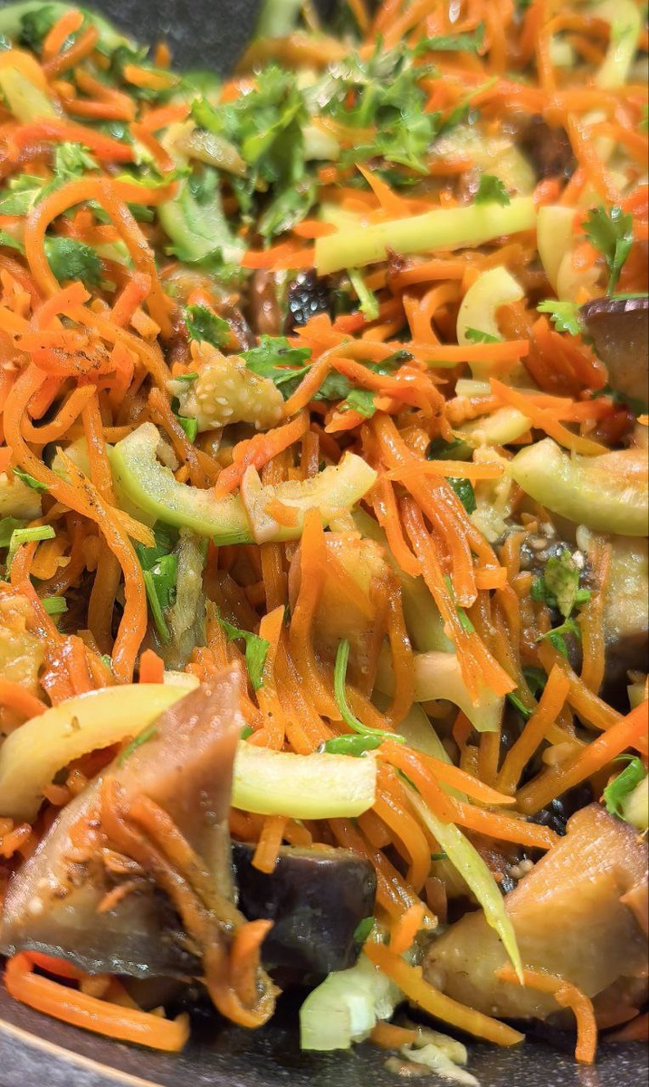 После того как баклажаны достигнут нужной степени готовности, в сковороду добавляется корейская морковка с маринадом, что придаст дополнительную сочность и вкус. Накройте сковороду крышкой и дайте блюду «отдохнуть» на минимальном огне, пока можно освежиться под душем.