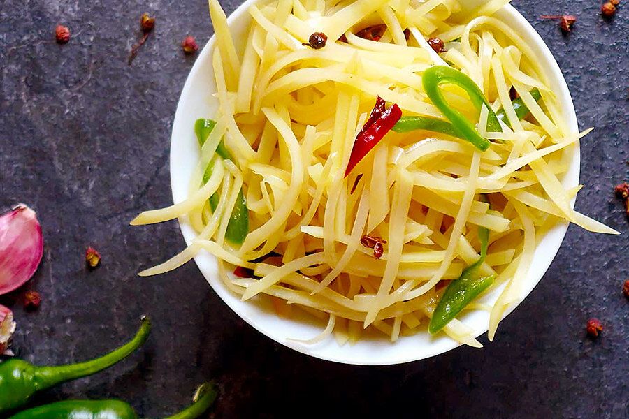 Картоплю нарізати соломкою і промити для видалення зайвого крохмалю. Виложити на паперовий рушник і просушити.Часник подрібнити, а чилі нарізати на шматочки.Розігріти велику сковороду на сильному вогні. Влити олію і додати сушений чилі та сичуанський перець. Обсмажувати до появи аромату, уникати підгорання.Додати нарізані чилі, часник та картоплю. Перемішуючи, обсмажувати до готовності картоплі, яка має залишатися зовсім трохи хрусткою.Додати темний рисовий оцет і посолити за смаком. Усе швидко перемішати і знімати з вогню. Готово.Смачного!