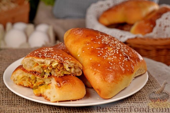 Дрожжевые пирожки на кефире: готовятся с начинкой из молодой капусты, моркови и лука. Перед выпечкой их смазывают желтком и посыпают кунжутом, что делает их особенно аппетитными.