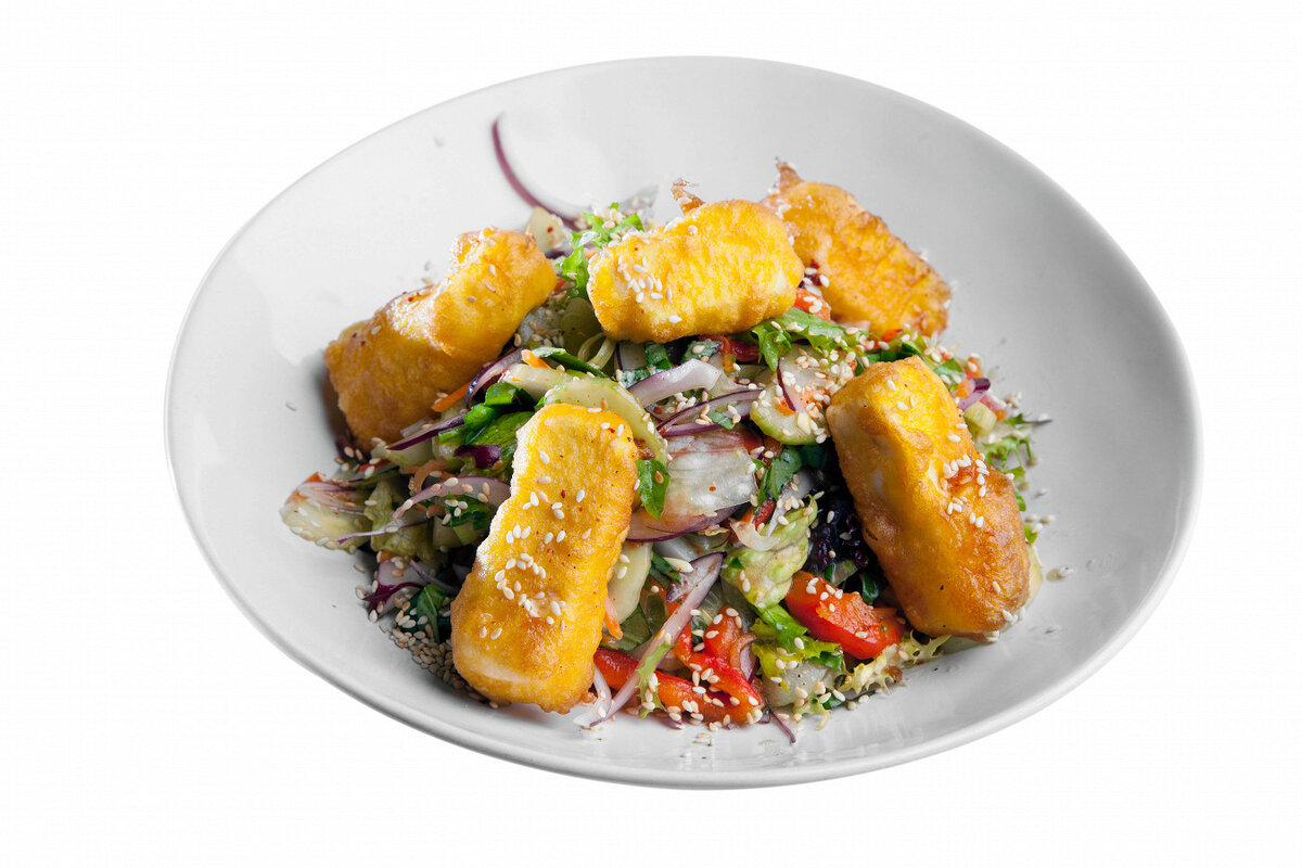 Сладкий перец следует запекать в предварительно разогретой до 180 градусов духовке с функцией гриля в течение 20 минут.Лук нарезать соломкой, огурцы очистить и нарезать полукольцами, а базилик – крупно. Достать перец из духовки, снять кожицу и также нарезать соломкой.Приготовить заправку: смешать соевый соус, сок лимона и апельсина, кунжутное масло, хлопья чили и смесь перцев.На сковороде слегка обжарить кунжут. Далее объединить овощи с приготовленной заправкой.Приготовить темпуру, смешав муку с водой в равных пропорциях и добавив куркуму, добившись консистенции, аналогичной тесту для блинов.Тофу нарезать брусками, обвалять в крахмале, затем окунуть в темпуру и обжарить в горячем масле до золотистого цвета.Готовый тофу выложить на подушку из салата, посыпать кунжутом и подавать сразу же.Пусть этот салат станет ярким акцентом на вашем столе, радуя глаз и приносить удовольствие от вкуса!