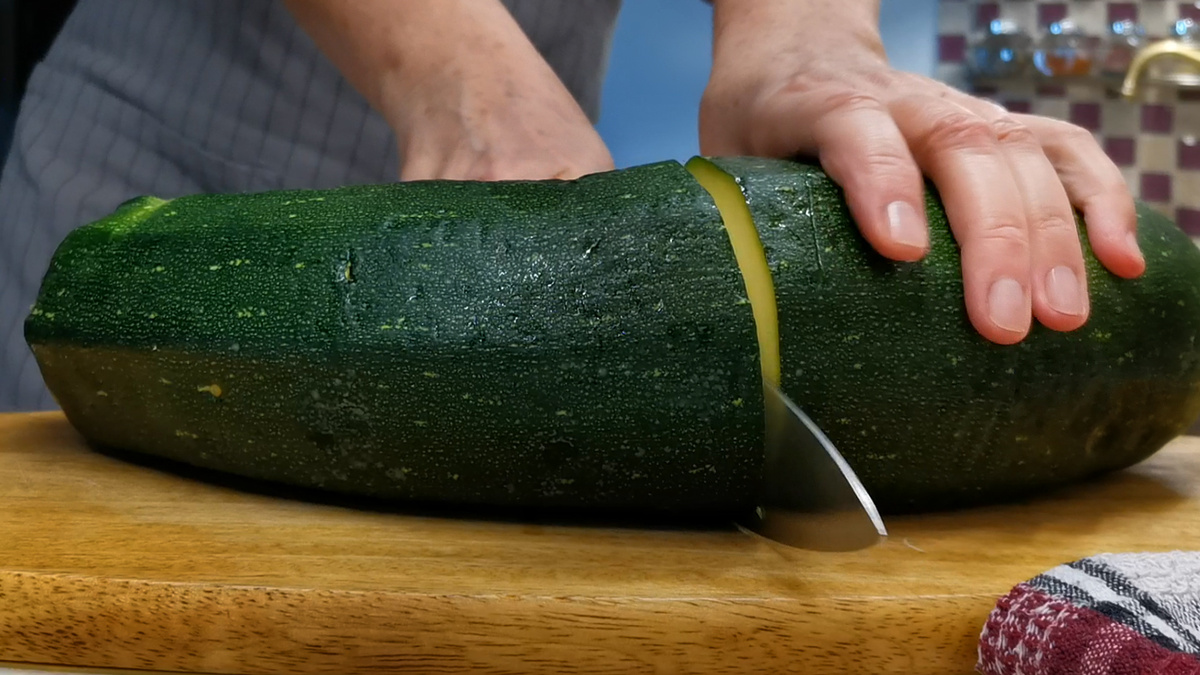 Приступаем к приготовлению с кабачков. Если они крупные и переросшие, это отличный повод использовать их в этом рецепте. Очищаем кабачок, удаляем семечки и оставляем только мякоть. Никакие отходы не будут потрачены зря, так как они превращаются в невероятную выпечку.