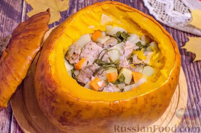 И, конечно, запечённое мясо с картофелем в тыкве станет настоящей находкой на вашем столе. Простое, но эффектное блюдо удивит гостей необычной подачей, ведь "посуда" – яркая тыква!