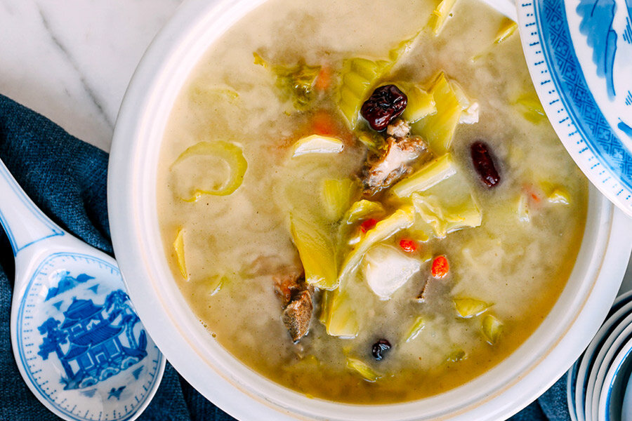 Сначала замочить свиные кости в холодной воде на 1-2 часа, меняя воду один раз за это время.Тем временем нарезать квашеную горчицу и порезать имбирь на ломтики.Переложить кости в кастрюлю с водой, довести до кипения и варить около одной минуты. Снять с огня, промыть кости и отложить в сторону.Разогреть сковороду на среднем огне, добавить масло и обжарить свиные кости со всех сторон до золотистой корочки.Переложить кости в кастрюлю, залить кипятком, добавить имбирь и снова довести до кипения.После закипания уменьшить огонь, накрыть крышкой и варить примерно 30 минут, чтобы бульон стал сливочно-белым.Убавить огонь до минимума и продолжать готовить еще 1 час, пока мясо не станет мягким. Удалить лишний жир с поверхности супа.Добавить к супу квашеную горчицу, ягоды годжи и китайские финики, вновь довести до кипения и готовить еще 20 минут. Не забудьте посолить по вкусу перед подачей.Приятного аппетита!