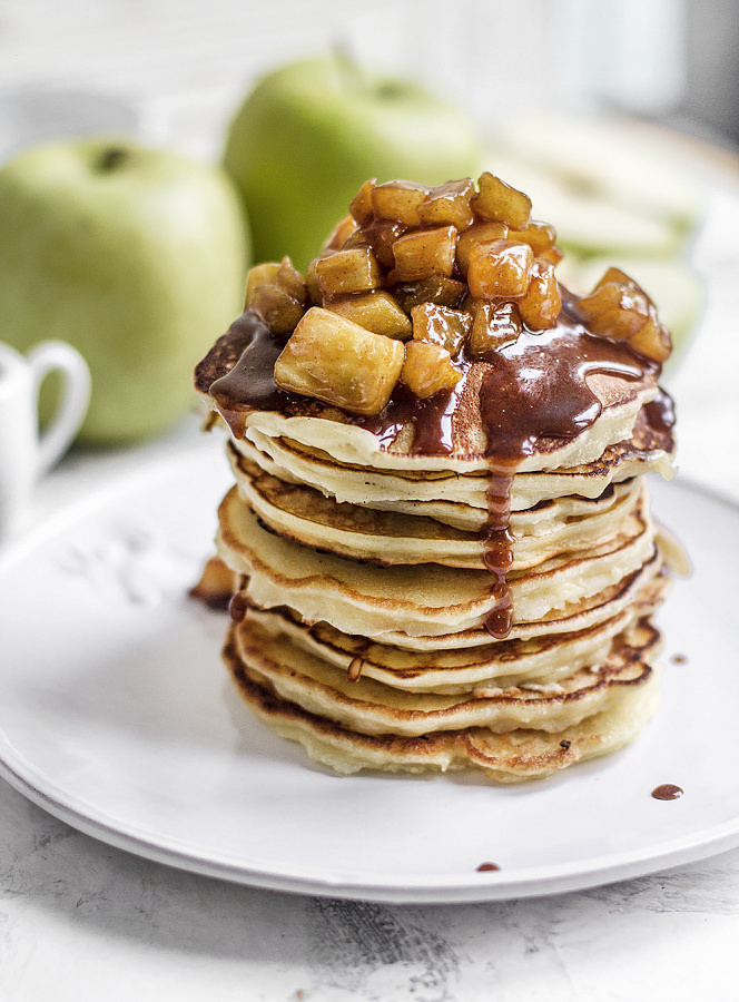 Шаг 4: Чтобы приготовить карамель, растопить сливочное масло в сотейнике, добавить оставшийся сахар и нарезанные яблоки. Варить на среднем огне, постоянно помешивая, до достижения янтарно-коричневого цвета. Влить сливки, добавить корицу и варить еще пару минут до получения однородной смеси. Перед подачей полить оладьи свежеприготовленной карамелью и наслаждаться теплыми угощениями.