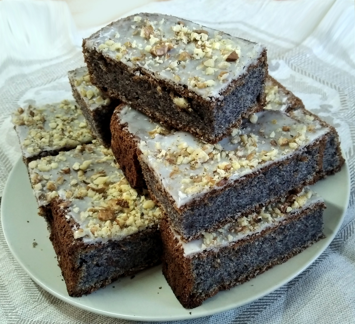 Для глазури сахарную пудру соединяют с лимонным соком и размешивают до полного однородного состояния. Глазурью покрывают пирог и посыпают измельченными грецкими орехами. После того как помадка застынет, маковый пирог нарезают на части. Приятного аппетита!