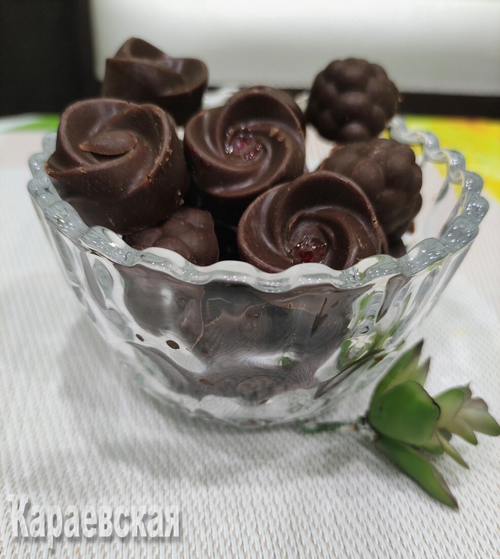 Подготовьте формочки для конфет. Наполните каждую из них примерно наполовину получившейся шоколадной смеси. В центр каждой формочки аккуратно поместите по одной ягоде — лучше использовать замороженные фрукты. После этого добавьте оставшуюся шоколадную массу, чтобы полностью заполнить формочки. Поместите их в холодильник для окончательного застывания.
