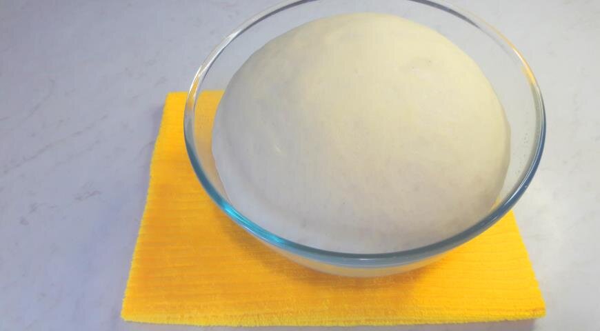 После замеса округляем тесто в шар и помещаем его в смазанную растительным маслом миску. Накрываем пленкой или полотенцем и оставляем в теплом месте на 1 час для подъема.