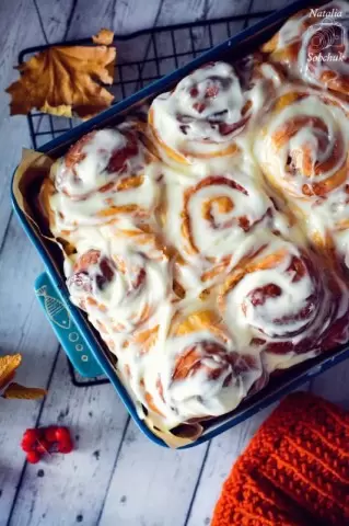 Готовые булочки покрываются кремом, приготовленным из 150 г творожного сыра, столовой ложки сметаны и по вкусу добавленной сахарной пудры. Этот крем станет изюминкой вашего десерта.