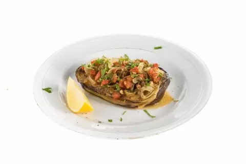 Подготовка баклажанов: Сначала удаляется часть кожуры с баклажанов, оставляя полоски. Затем их разрезают пополам и делают несколько глубоких надрезов в мякоти. Баклажаны необходимо щедро посолить и оставить на 15 минут для удаления лишней влаги. После этого их промывают, отжимают и высушивают с помощью бумажных полотенец.Обжарка баклажанов: На разогретой сковороде с растительным маслом обжаривают баклажаны до появления золотистой корочки с обеих сторон. Готовые баклажаны перекладывают на бумажное полотенце, чтобы убрать излишки масла.Приготовление начинки: В глубокой миске смешивают нарезанный полукольцами лук, измельченный чеснок, оливковое масло, сушеную мяту, соль и перец. Массу перемешивают руками, чтобы лук пустил сок. Затем добавляются нарезанные кубиками помидоры и рубленая петрушка, все хорошо перемешивается.Фаршировка баклажанов: В баклажанах создают углубления и заполняют их овощной начинкой. Затем фаршированные баклажаны помещают в толстостенную кастрюлю. В отдельной емкости соединяют 125 мл воды, оставшееся масло, сок половины лимона и сахар, после чего заливают этой смесью баклажаны. Блюдо готовится на среднем огне под крышкой в течение 40-50 минут. После готовности его нужно дать остыть до комнатной температуры и подавать с долькой лимона, посыпав свежей петрушкой.