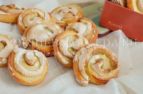 После того как тесто охладилось, разделить его на две части и раскатать в прямоугольный пласт толщиной около 4-5 мм. Поверхность теста покрыть взбитым безе. Свернуть в рулет и аккуратно нарезать на порции толщиной 1,5-2 см. Выложить на противень, застеленный пергаментной бумагой, и выпекать при температуре 200 градусов в течение 15-20 минут, пока не появится золотистый цвет.