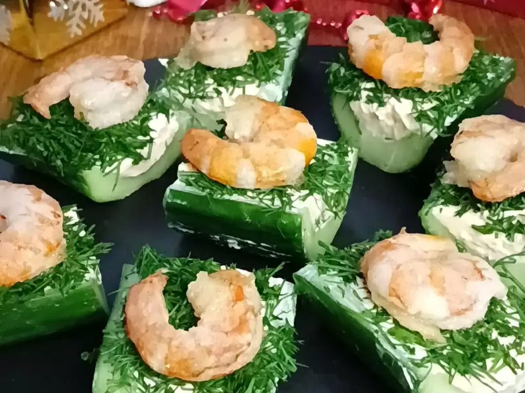 Огурец разрезается вдоль, удаляются семена, а дно немного укорачивается для устойчивости. Лодочки заполняются творожным сыром, нарезанным на порционные дольки. Каждый кусочек обваливается в укропе и увенчивается креветкой, запеченной на сливочном масле. Отличный вариант для тех, кто ценит лёгкие и оригинальные закуски.