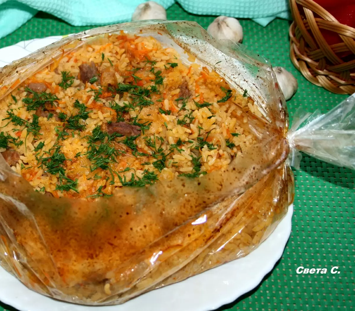 Переложите смесь в пакет для запекания, добавьте воду и завяжите его, проколов несколько отверстий иголкой для выхода пара. Пакет разместите на противне и отправьте в разогретую до 180°C духовку на 45-50 минут. После этого ароматный плов будет готов к подаче!