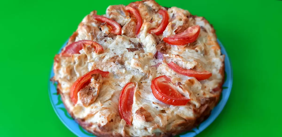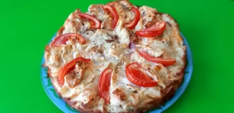 Для начинки используйте любимые продукты. Хорошо подойдут сервелат, нарезанный соломкой, и натертая моцарелла. Разогрейте форму, смазанную растительным маслом, и выложите на дно половину лавашной смеси, затем добавьте колбасу и сыр, накройте оставшейся смесью и нарезанными ломтиками помидоров.