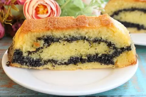 Форму для выпечки стоит взять в виде буханочки. На дно выложите треть теста, поверх него равномерно распределите половину маковой начинки. Далее опять слой теста, оставшаяся начинка, и завершите верхним слоем теста.