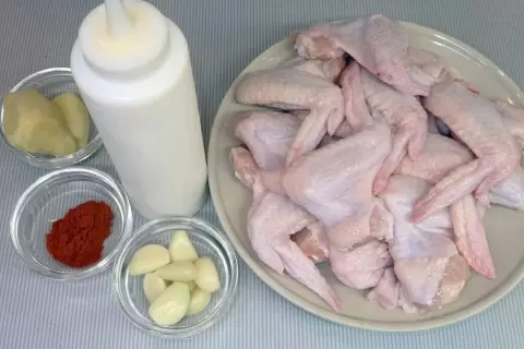 Корень имбиря натираем на крупной терке, а чеснок – на мелкой. В глубокой миске соединяем подготовленные крылышки с чесноком, имбирём, паприкой, майонезом, солью и перцем. Хорошо перемешиваем все ингредиенты, чтобы они равномерно распределились.