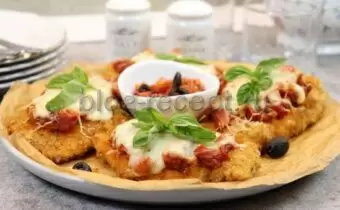 Каждый кусок курицы панировать в муке, затем обмакнуть в яичной смеси и, наконец, обвалять в сухарях. Обжарить шницели на среднем огне до золотистой корочки с обеих сторон. После обжаривания переложить их на противень, добавив по ложке соуса и сверху посыпав моцареллой и пармезаном.