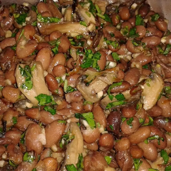 Когда фасоль будет готова, слив остаток воды, переместите её в миску. Туда же добавьте приготовленные грибы с луком, молотые грецкие орехи, зелень и перец. Тщательно перемешайте все ингредиенты перед подачей.