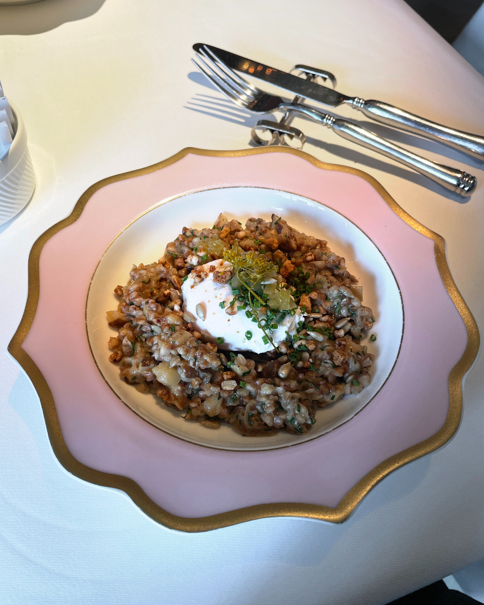 Однако самым ожидаемым моментом стало представление гречневой каши с белыми грибами и яйцом пашот. Это блюдо удивило своей гармонией: ароматная рассыпчатая гречка на фоне нежного грибного соуса, а маринованные огурцы и укроп отлично дополняют композицию. Яичный желток, вмешанный в кашу, добавляет новую истину к этому кулинарному произведению.