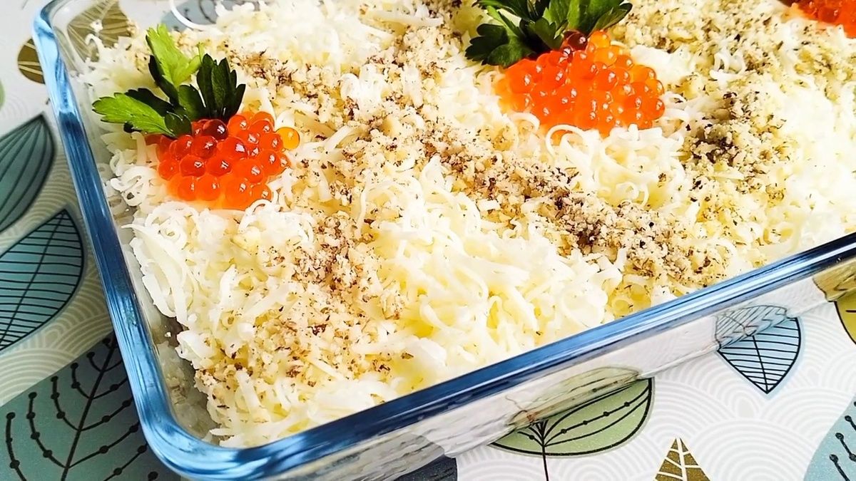 В качестве украшения рекомендуются измельченные грецкие орехи, красная икра и свежая зелень по вкусу. Такой подход к оформлению сделает салат не только вкусным, но и привлекательным внешне!