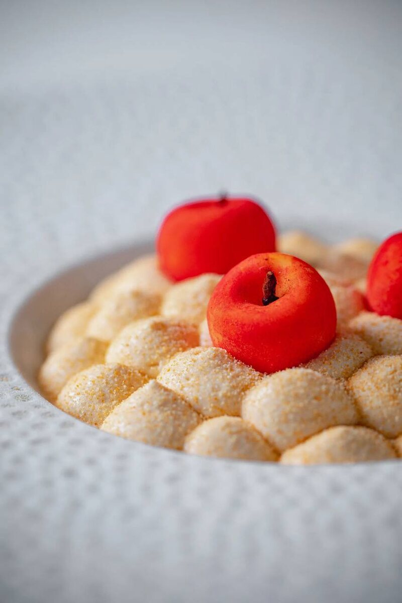 - Вершина: Кулинарный шедевр завершает печёное яблоко, представленное в виде сорбета и заключённое в хрустящую корочку из карамелизированного белого шоколада.