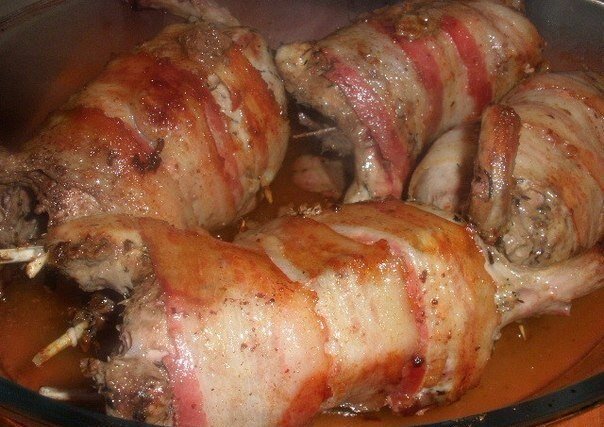 Сначала перепелов нужно хорошо промыть и обсушить. Затем обернуть их в пластинки бекона, приправить солью и черным перцем. Ветчину нарезать тонкими ломтями, а шницели - аккуратно отбить. Перепелов оборачивают сначала в ветчину, затем в шницели, фиксируя их ниткой.