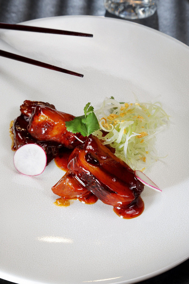 Свиные ребра становятся частью кулинарного шедевра, который требует множество ингредиентов. В этом блюде прекрасно сочетаются соусы хойсин и тобанджан, клюквенный джем, кукурузные хлопья, а также паста чу-хоу — все это создаёт неповторимый вкус.
