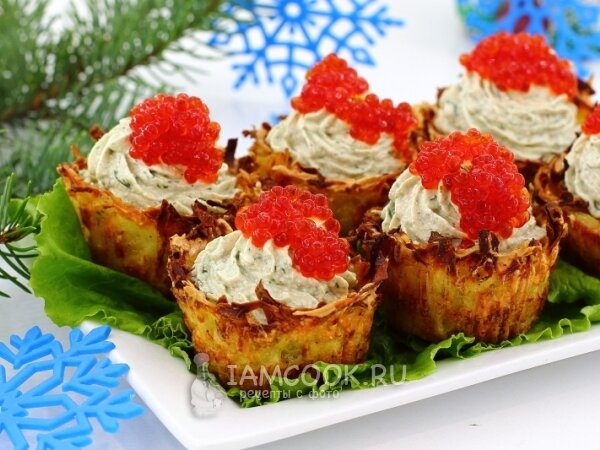 - Картофельные корзиночки с селедочным кремом: В готовые корзиночки из картофеля можно начинить вкусным селедочным кремом с яблоком и шпинатом. Всего 60 минут на приготовление, а калорийность — всего 117 кКал.