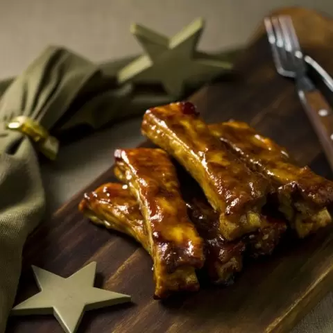 Для этого блюда понадобятся свиные ребра весом 1,5 кг, мед (100 г), зернистая горчица (50 г), соевый соус (70 мл), 5 зубчиков чеснока, 2 ч.л. копченой паприки, а также специи по вкусу. Ребра нарезаются на порционные куски и маринуются в готовой смеси на 4 часа (лучше оставить на ночь). Готовятся на углях около 40-50 минут, периодически переворачиваясь и смазывая остатками маринада.