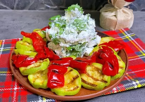 Теперь приступаем к овощам. Кабачки и перец необходимо нарезать на средние кусочки, слегка смазав их маслом. Обжаривание на гриле сделает их ароматными и аппетитными. После обжарки, овощи выкладывают в миску и приправляют оставшимися специями, перемешивая до равномерного распределения.