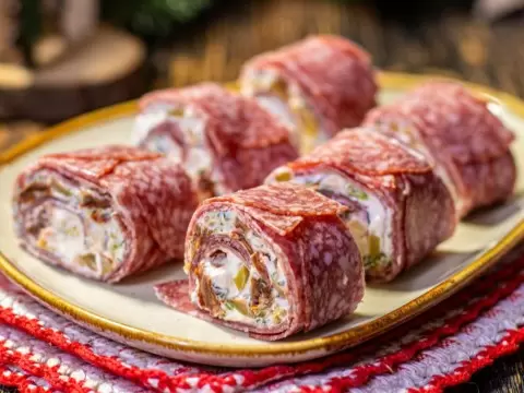 Теперь на слой колбасы равномерно выкладывается начинка. Главное – не переборщить с количеством, иначе начинка может вытечь. Аккуратно сверните рулет с помощью пленки и уберите его в холодильник хотя бы на 1-2 часа, чтобы масса стабилизировалась. Этот шаг крайне важен для того, чтобы рулет не разваливался при нарезке.