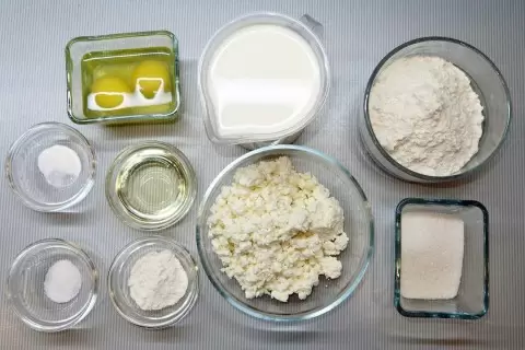 Для достижения наилучших результатов лучше использовать ингредиенты комнатной температуры. В глубокой миске тщательно перемешать яйца, сахар, щепотку соли и ванилин с помощью миксера до получения однородной смеси. Затем добавляется творог. Если требуется, чтобы готовые блинчики были однородными, стоит использовать погружной блендер.