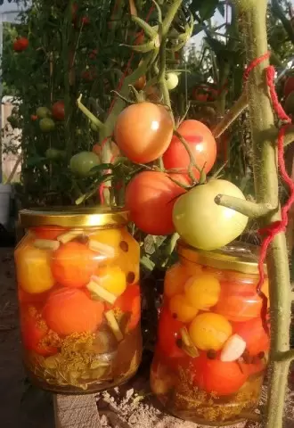 Затем вода сливается, доводится до кипения и заливается обратно в банки на 10 минут. По желанию, можно укладывать помидоры дважды, что сделает их более насыщенными и ароматными. Приготовленный маринад заливается в третьем подходе, добавляется эссенция, банки закатываются и укутываются для остывания.