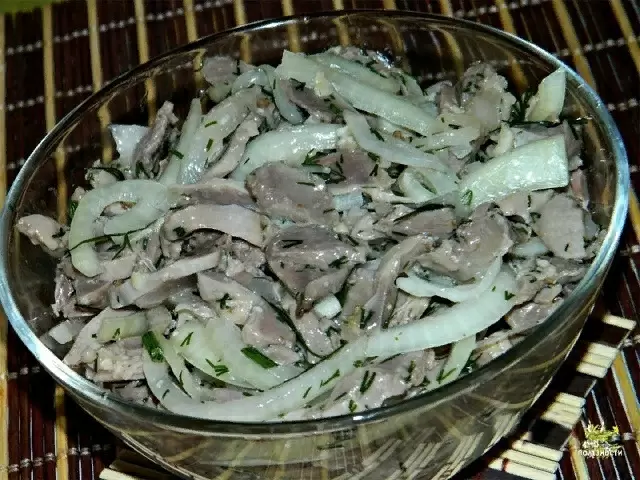 Сначала куриные желудочки тщательно промывают, затем отвариваются в подсоленной воде на протяжении примерно полутора часов. После этого их следует остудить и нарезать крупной соломкой. Лук нарезать полукольцами и залить уксусом в небольшом контейнере, оставив его на полчаса, не забывая периодически перемешивать.