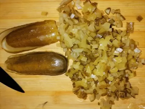 Когда бульон будет готов, переходите к обжариванию ингредиентов. Лук мелко нарежьте, а морковь натрите на терке. Соленые огурцы и колбасу достаньте и нарежьте кубиками.