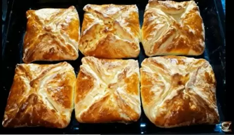 После того как все части будут готовы, чуть раскатайте их, добавьте начинку и сложите в форме конвертов. Выложите изделия на противень, смажьте взбитым яйцом и выпекайте в предварительно разогретой духовке при температуре 180 градусов около 20 минут.
