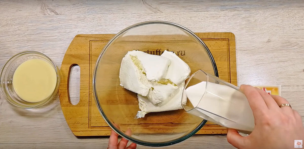 Для начала творог желательно размять с помощью погружного блендера до однородной консистенции. Затем влить сливки комнатной температуры и добавить сгущенное молоко. Практически сразу же после этого можно внести щепотку ванили для аромата и всё тщательно перемешать.