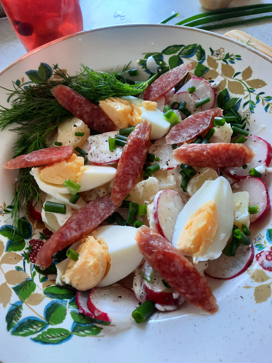Начать с нарезки картофеля и редиски тонкими кружочками. Добавить щепотку соли и свежемолотого черного перца. В этой стадии следует заправить только картофель и редис сметаной, в то время как остальные ингредиенты будут расположены сверху.